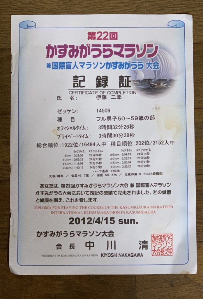 ベストタイム::2012年4月 かすみがうらマラソン 3時間30分38秒(54歳)